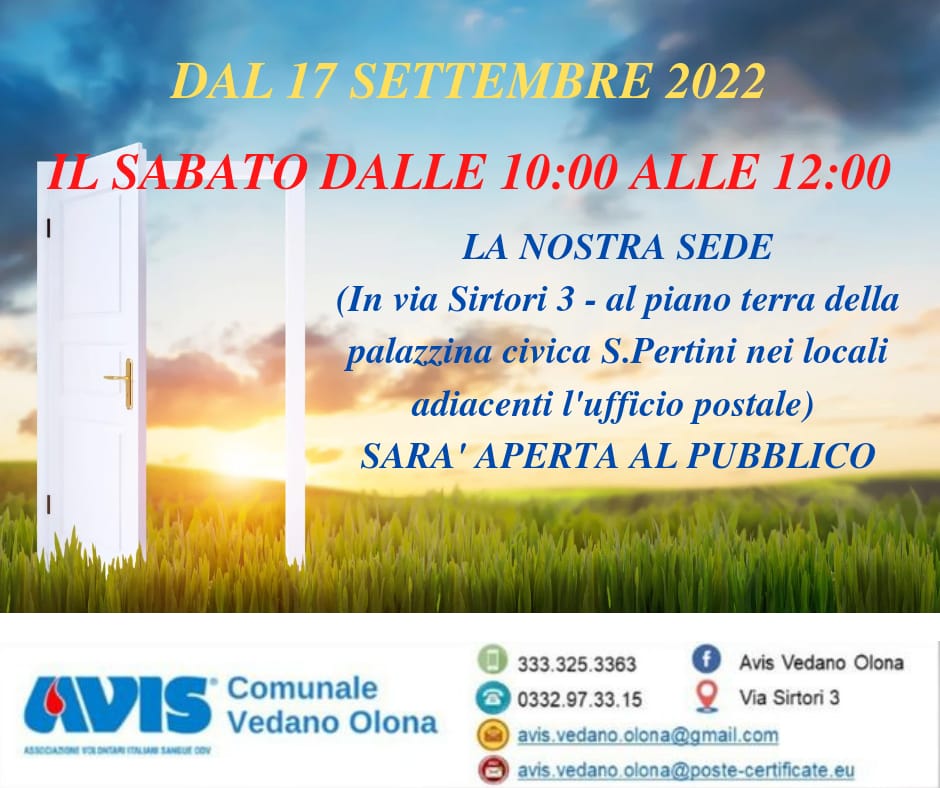 Si avvisa che dal 17 settembre, la sede Avis Comunale in via Sirtori, sarà aperta al pubblico il sabato dalle ore 10 alle ore 12.