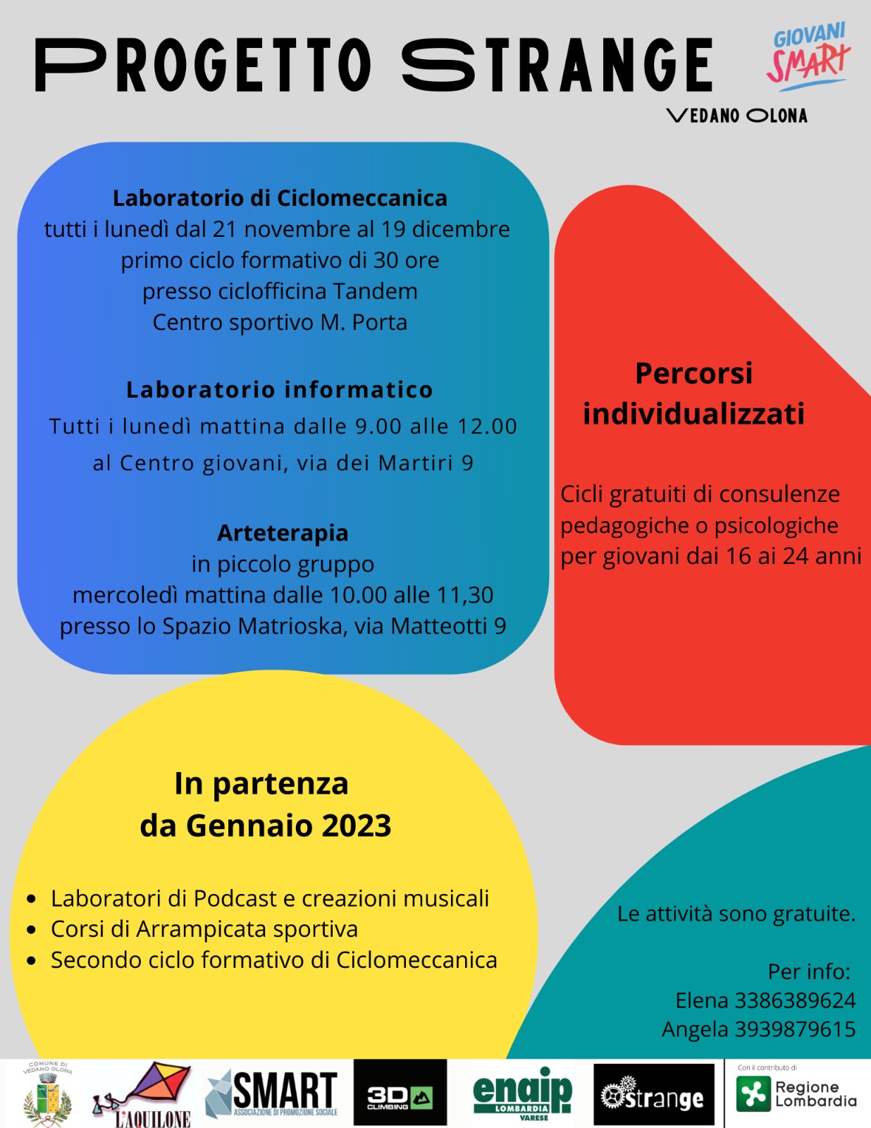 Con il progetto Strange finanziato dalla Regione Lombardia – Bando SMART, questo Comune organizza laboratori, percorsi individualizzati e corsi, in collaborazione con la Coop. Soc. L’Aquilone di Sesto Calende a cui è affidata l’attività del Centro di Aggregazione Giovanile