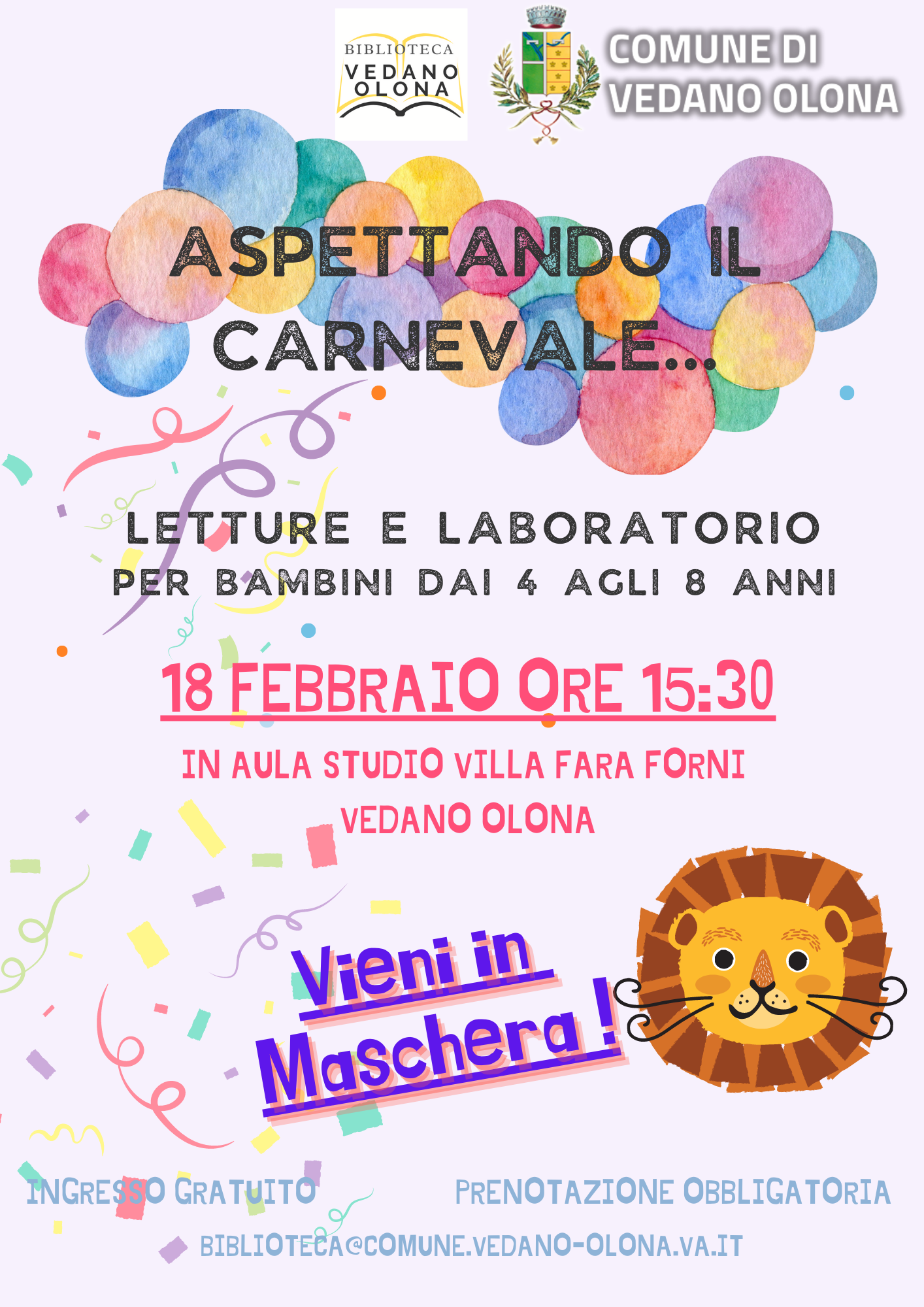 L’evento di domenica pomeriggio sarà preceduto, il giorno precedente, da un’iniziativa collegata al Carnevale e organizzata dalla Biblioteca comunale, insieme al Comune di Vedano Olona. L’evento, intitolato “Aspettando il Carnevale”, è in programma sabato 18 febbraio (a partire dalle ore 15.30) in Aula Studio di Villa Fara Forni. L’ingresso è gratuito, ma è necessaria la prenotazione obbligatoria. In programma letture e laboratorio per bambini dai 4 agli 8 anni, rigorosamente in maschera.