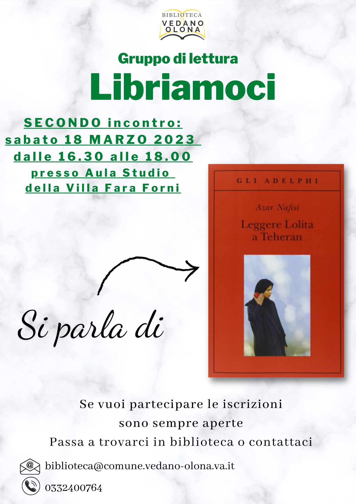 E’ in programma sabato 18 marzo (dalle 16.30 alle 18) il secondo incontro del gruppo di lettura Libriamoci, organizzato e ospitato dalla Biblioteca di Vedano Olona. L’appuntamento si terrà presso l’Aula Studio della Villa Fara Forni. Iscrizioni sempre aperte: per partecipare o per info: biblioteca@comune.vedano-olona.va.it oppure 0332-400764