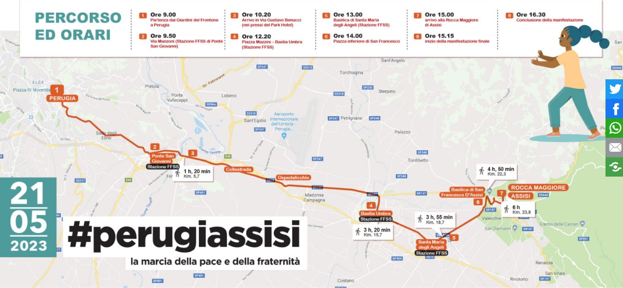 La prima marcia per la pace si svolse domenica 24 settembre 1961 su iniziativa d Aldo Capitini, che si batté affinché la marcia fosse una testimonianza vivida a favore della nonviolenza, della pace e della solidarietà tra i popoli. Nel 2021 la Marcia per la Pace ha compiuto 60 anni, percorrendo in ognuna delle edizioni 24 chilometri tra Perugia ed Assisi. Questa edizione del 21 maggio 2023 prevede la partenza da Perugia (ore 9) presso i Giardini del Frontone e arrivo ad Assisi (ore 15) presso la Rocca Maggiore.
