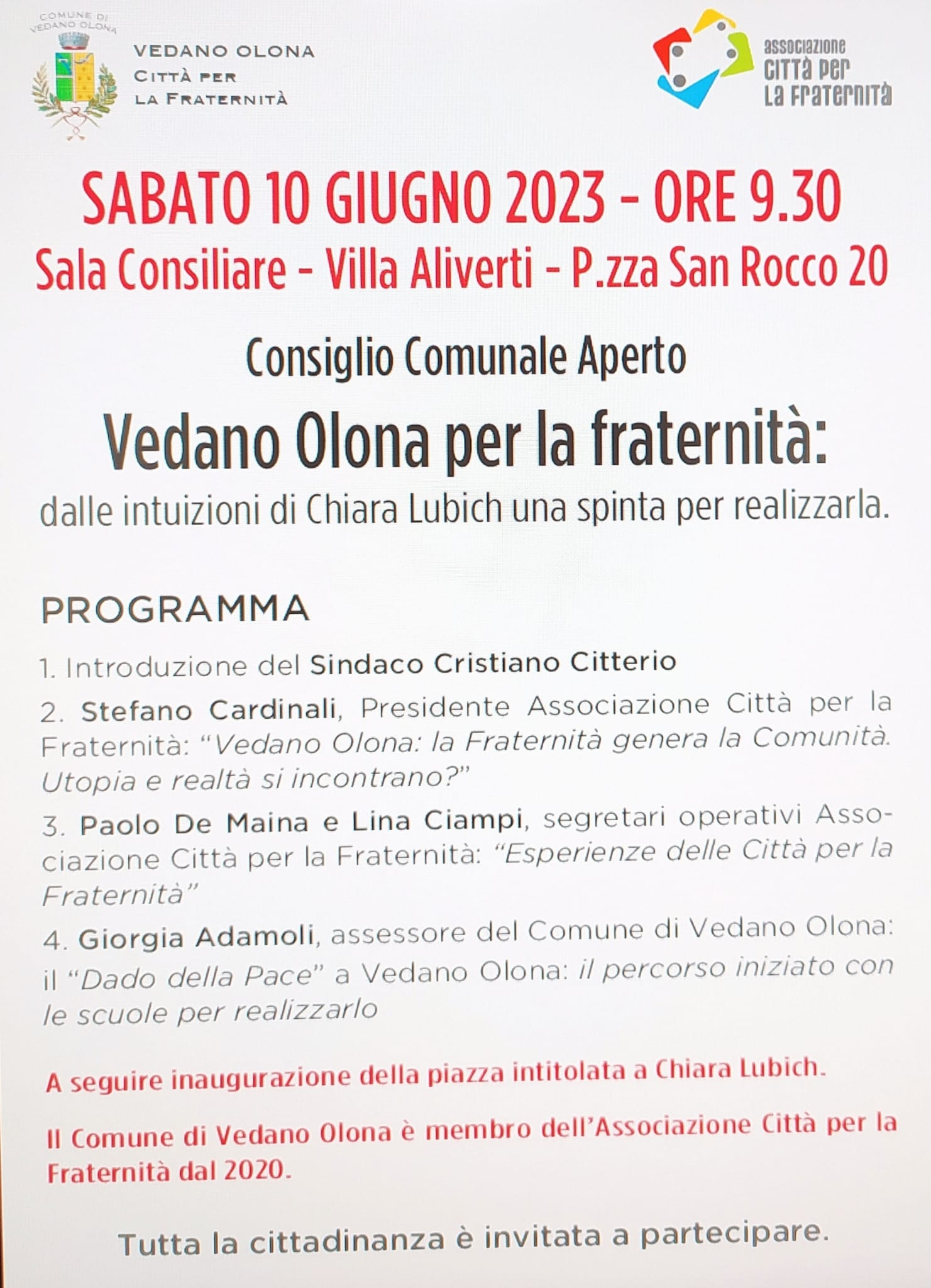 Sabato 10 giugno, una giornata dedicata a Chiara Lubich. A Vedano Olona è prevista l’inaugurazione della piazza dedicata a suo nome (presso ex Torre dell’Acquedotto, angolo di Via Cavour), col saluto del sindaco Cristiano Citterio, testimonianze di chi ha conosciuto Chiara Lubich e l’intervento del Consiglio Comunale dei Ragazzi e delle Ragazze. Il Comune di Vedano Olona è membro dell’Associazione Città per la Fraternità dal 2020. L’intitolazione di Piazza Chiara Lubich fa parte del progetto “Le Vie In Rosa” che ha rinominato al femminile una decina tra strade e piazze di Vedano Olona.