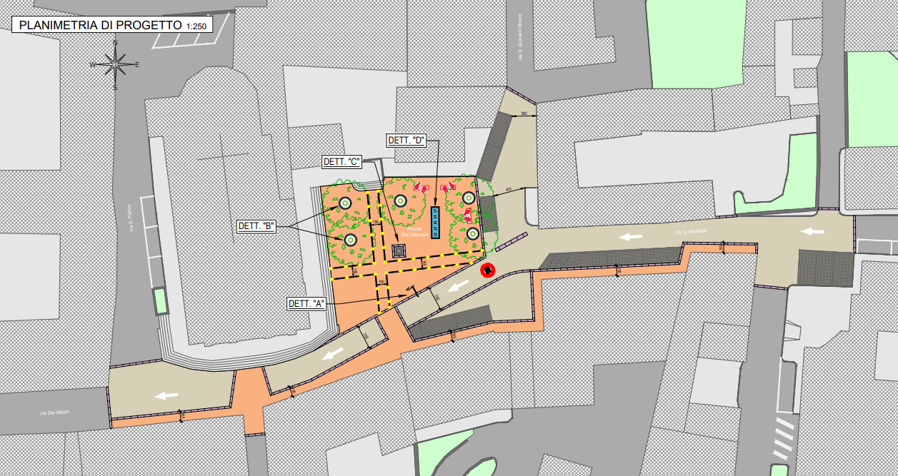 La parte a ridosso della gradinata sarà invece “libera”, pavimentata a nuovo e diventerà il Sagrato della Chiesa, cosa che fino ad oggi era resa impossibile dal fatto che tutta l’area di piazza San Maurizio fosse occupata da un parcheggio per le auto. Il monumento presente in piazza sarà valorizzato con pavimentazione e illuminazione dedicate, diventando punto di riferimento di tutta l’area fruibile.