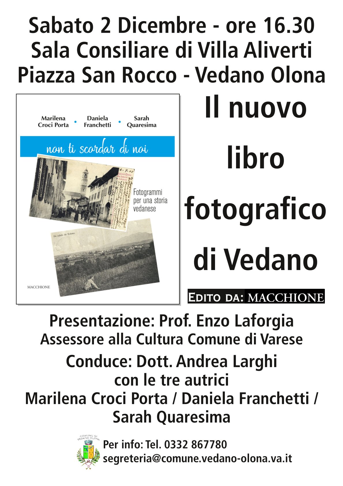 Appuntamento da non mancare con la storia e la cultura vedanesi. La data da segnare sul calendario, dedicata a parole e immagini della tradizione e della comunità, è sabato 2 dicembre in occasione della presentazione, presso la Sala Consiliare di Villa Aliverti , del libro “Non ti scordar di noi. Fotogrammi per una storia vedanese”. Il volume, edito da Macchione, è l’ideale prosecuzione del precedente “Vedano Olona. Frammenti di una storia” (uscito nel 2018 per i tipi dello stesso editore) ed è stato realizzato col patrocinio e col sostegno del Comune di Vedano Olona. Prima ancora, nel 1990, l’Amministrazione comunale pubblicato “Vedano. Segni, frammenti, immagini“, opera realizzata in due volumi e a cura della Biblioteca Comunale.