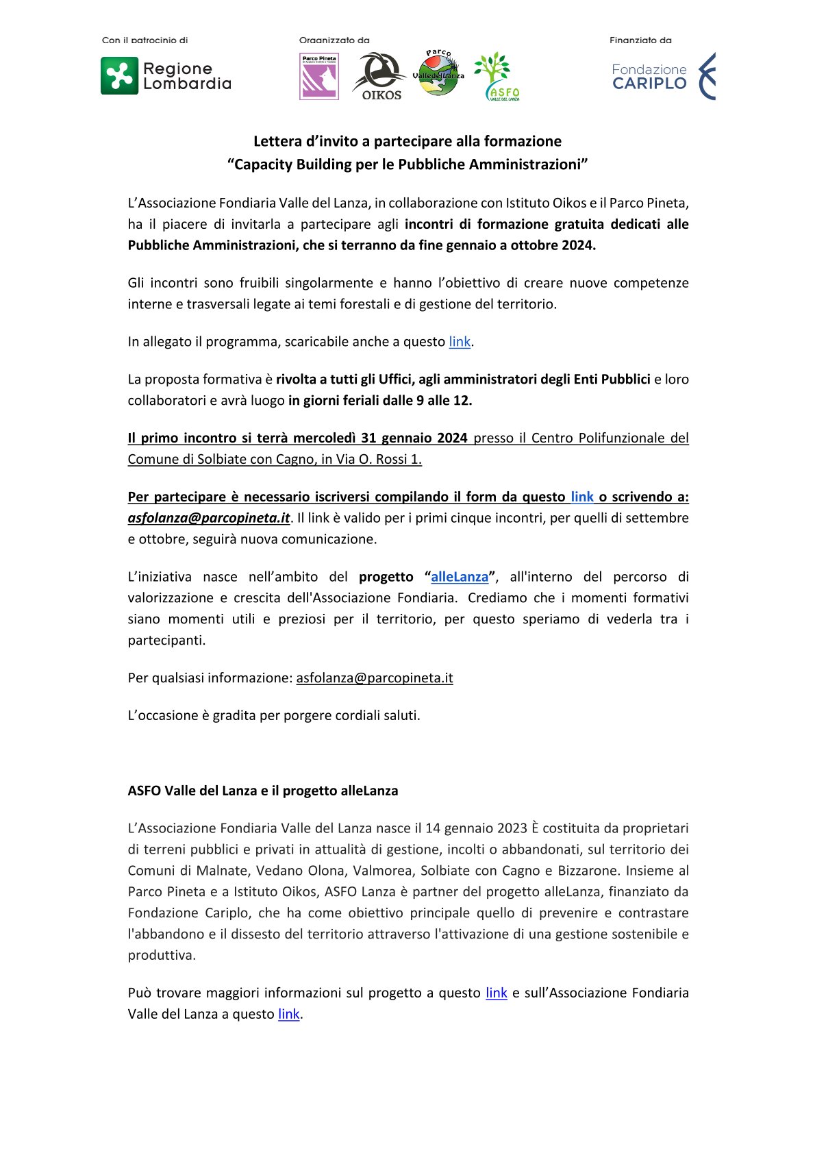 Si chiama “Capacity building” per le Pubbliche amministrazioni ed un progetto che prevede otto incontri gratuiti per integrare le tematiche ambientali nella programmazione e nelle attività comunali. L’iniziativa è patrocinata dalla Regione Lombardia ed organizzata da Parco Pineta, Oikos, Parco Valle del Lanza e ASFO. L’iniziativa è in programma da gennaio ad ottobre 2024, nei giorni feriali, in orario 9-12.
