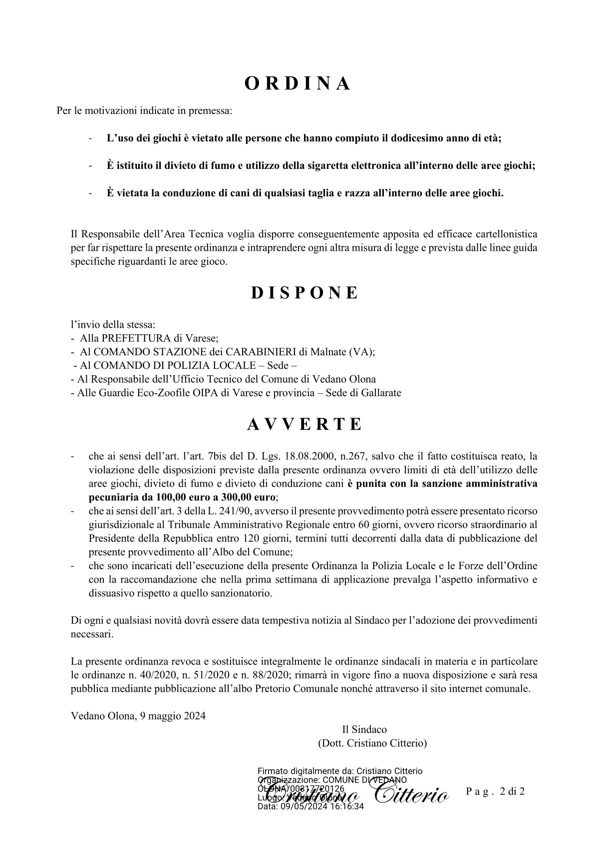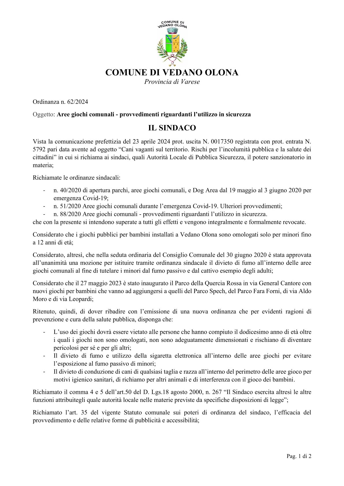 Emanata l’ordinanza numero 62/2024 avente per oggetto “Aree giochi comunali – provvedimenti riguardanti l’utilizzo in sicurezza”. Il testo completo in allegato (Ordinanza n.62 Aree Gioco)