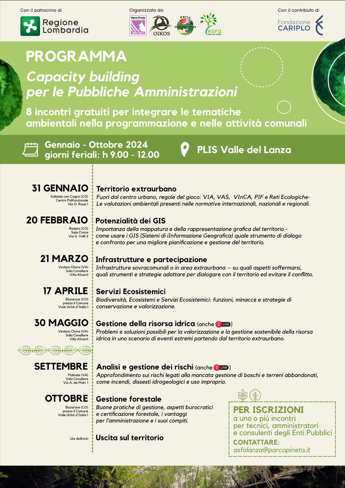 Questa occasione di formazione è organizzata da Istituto Oikos e dall’ASFO Valle del Lanza, insieme al Parco Pineta, nell’ambito del progetto “alleLanza”, avviato nel 2023 con il contributo di Fondazione Cariplo. Scopo dell’iniziativa è promuovere la gestione comunitaria dei terreni abbandonati al fine di prevenire e contrastare l’abbandono e il dissesto del territorio.