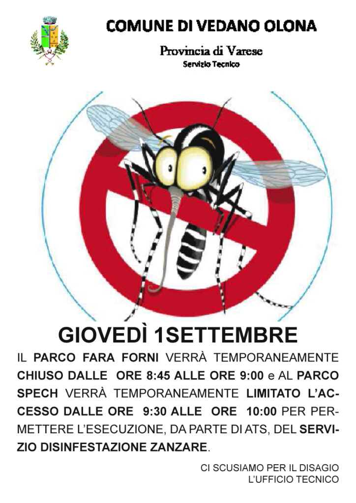 Si avvisa che MARTEDI’ 3 SETTEMBRE verrà effettuato, da parte di ATS Insubria il consueto servizio di disinfestazione zanzare come da programma delle zone: fondo campagna – parco via Leopardi e alcune vie limitrofe zona industriale parco Fara Forni cortile scuola dell’infanzia cortile scuola primaria parco Spech parco via Aldo Moro parco della Quercia […]