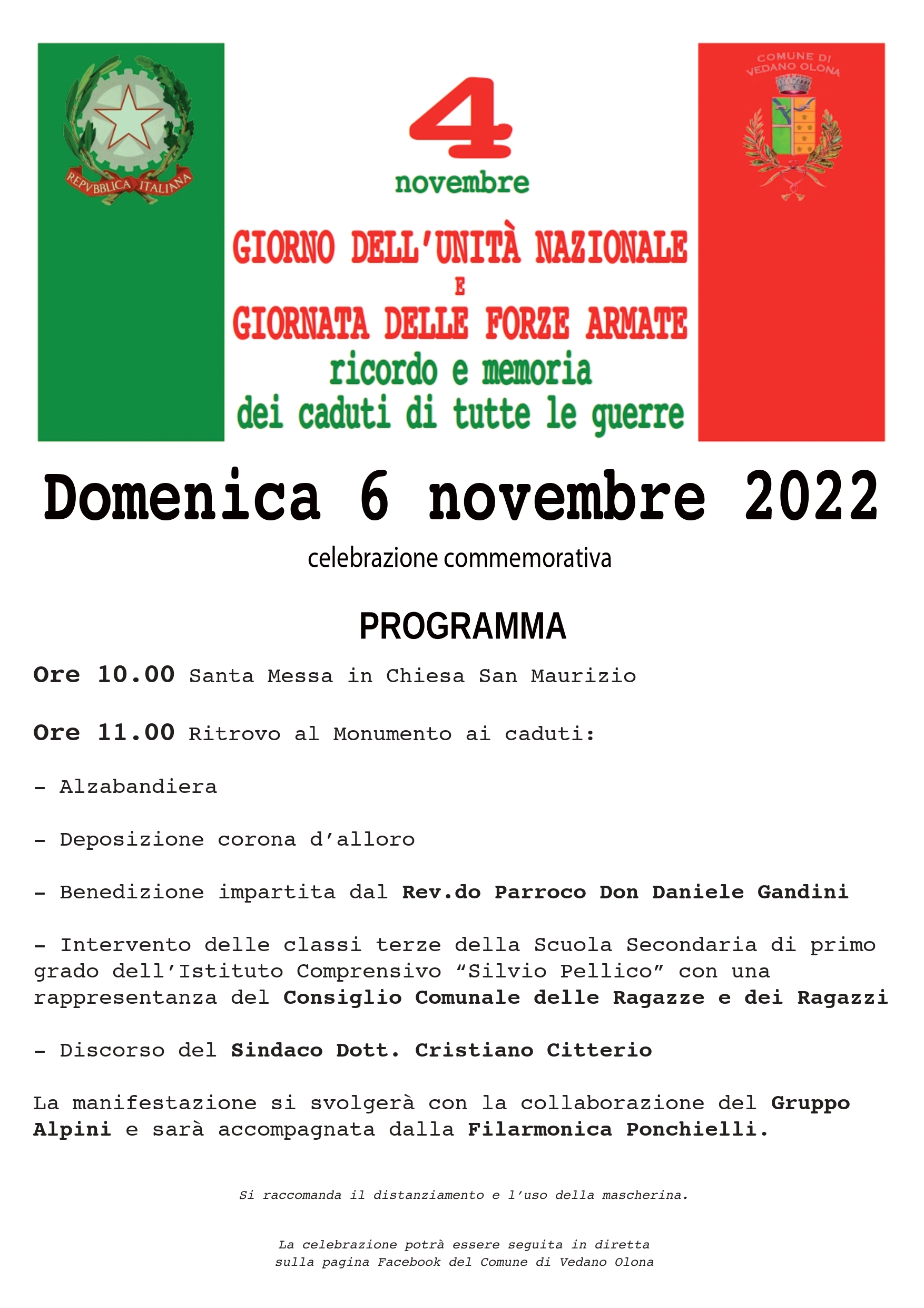 Domenica 6 novembre 2022 si svolgerà la celebrazione commemorativa del 4 novembre giorno dell’Unità Nazionale e Giornata delle Forze Armate in ricordo e memoria dei caduti di tutte le guerre, secondo il programma in evidenza.