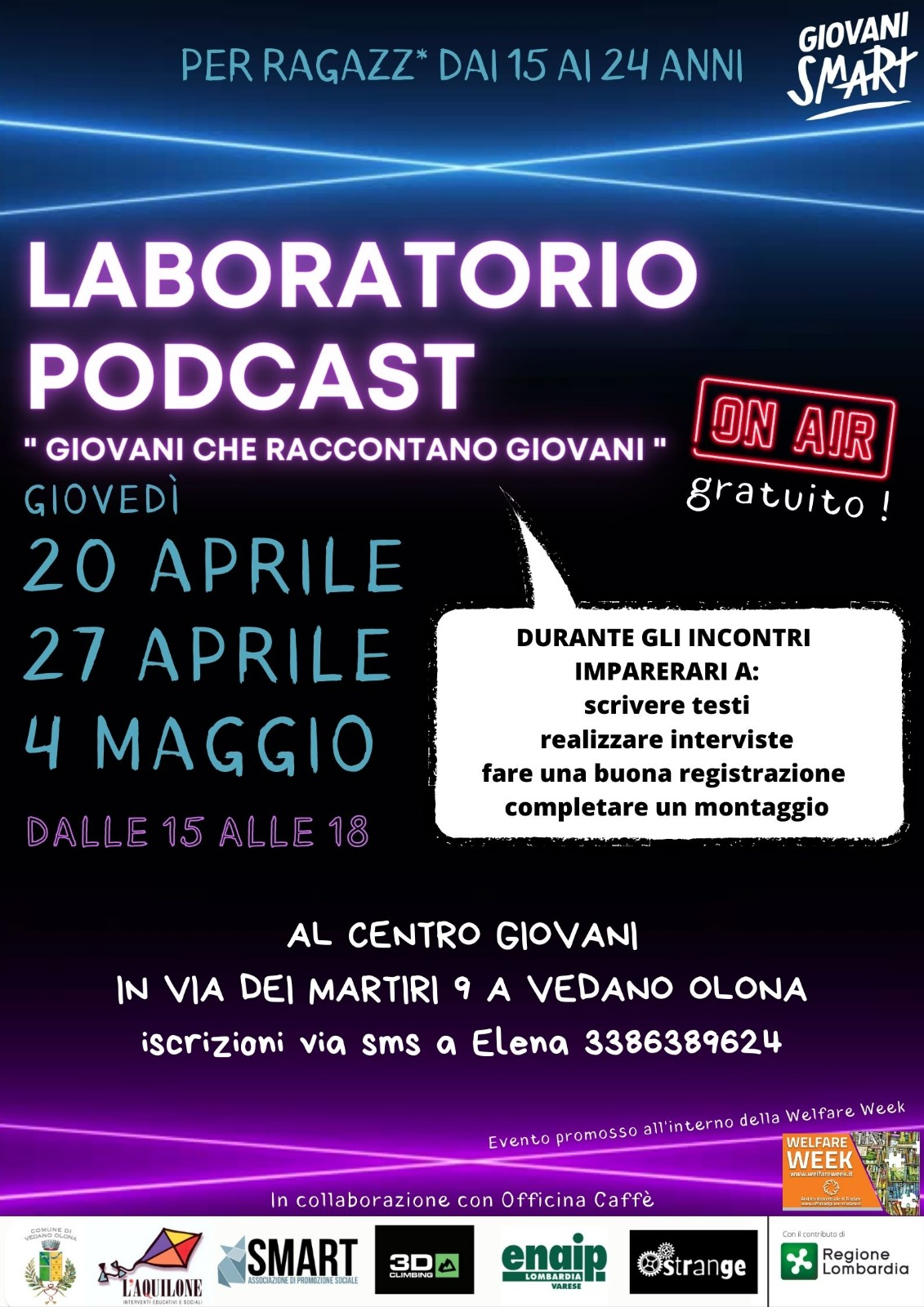 Nel cartellone della Welfare Week 2023 due iniziative molto interessanti per i giovani a Vedano Olona. Domani, giovedì 20 aprile, presso il CAG (Centro di aggregazione giovanile), si svolgerà un laboratorio di Podcast, il primo di tre appuntamenti (gli altri giovedì 27 aprile e giovedì 4 maggio) in programma dalle 15 alle 18. Il ciclo […]