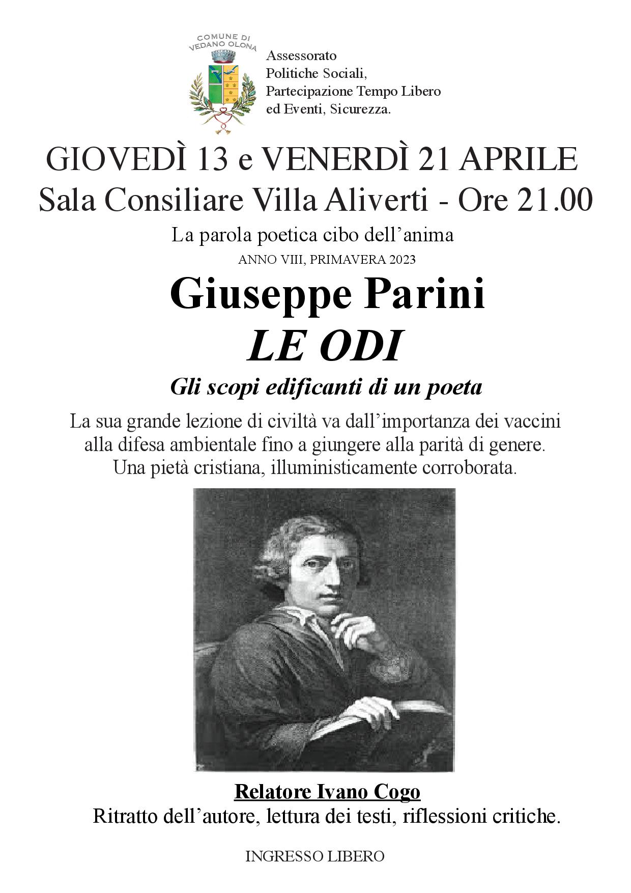 Due serate con Giuseppe Parini: per il ciclo “La parola poetica cibo dell’anima”, giunto ormai all’ottavo anno, sono in programma due appuntamenti a Villa Aliverti (ore 21), giovedì 13 e venerdì 21 aprile. Le serate sono dedicate all’opera più nota del poeta, “Le odi”: “La sua grande lezione di civiltà va dall’importanza dei vaccini alla […]