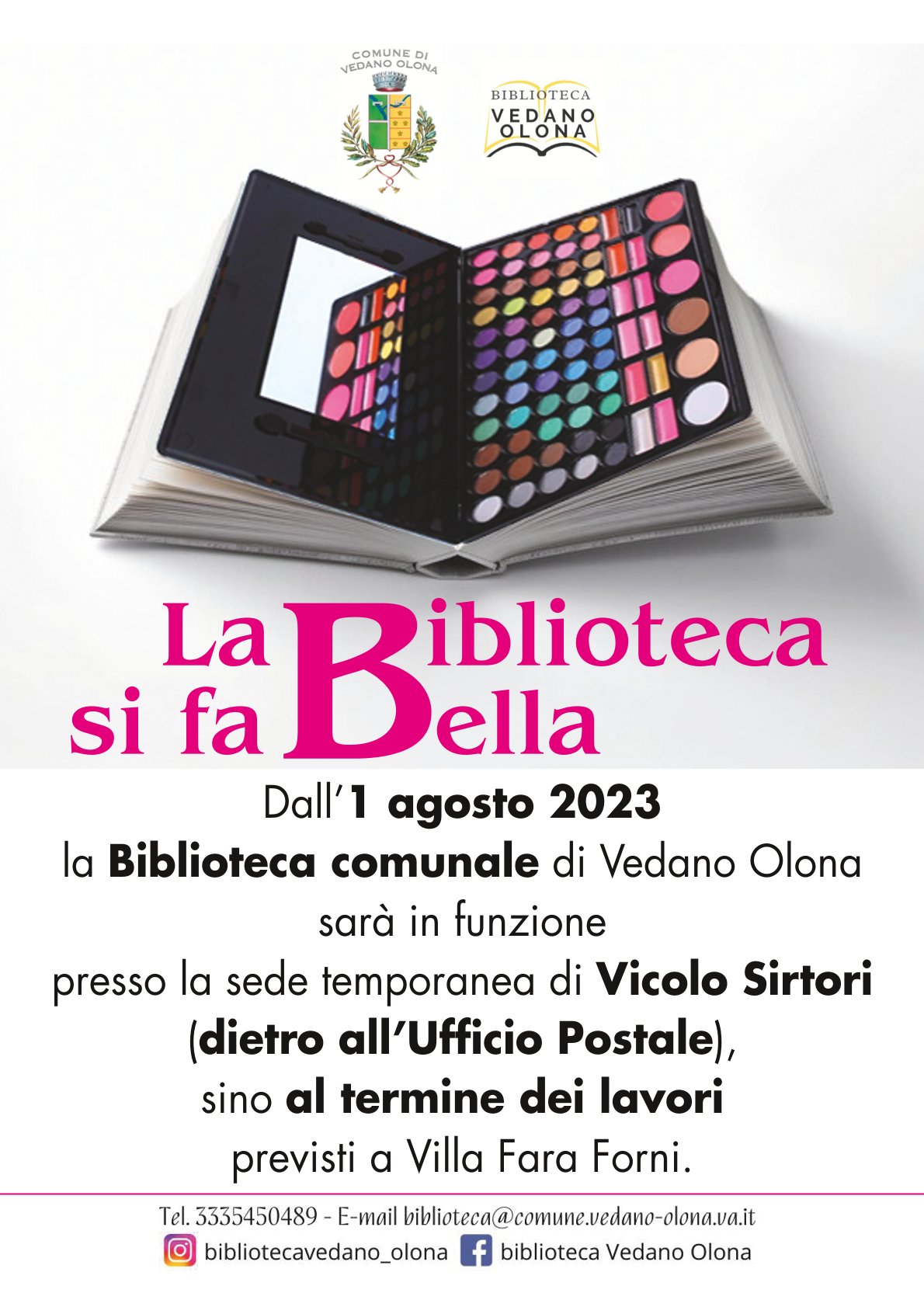 Il punto prestito della biblioteca sarà chiuso per ferie da lunedì 14 a giovedì 17 agosto. Riapertura prevista venerdì 18 agosto. Tel. 0332/400764-333.54.50.489 Mail: biblioteca@comune.vedano-olona.va.it